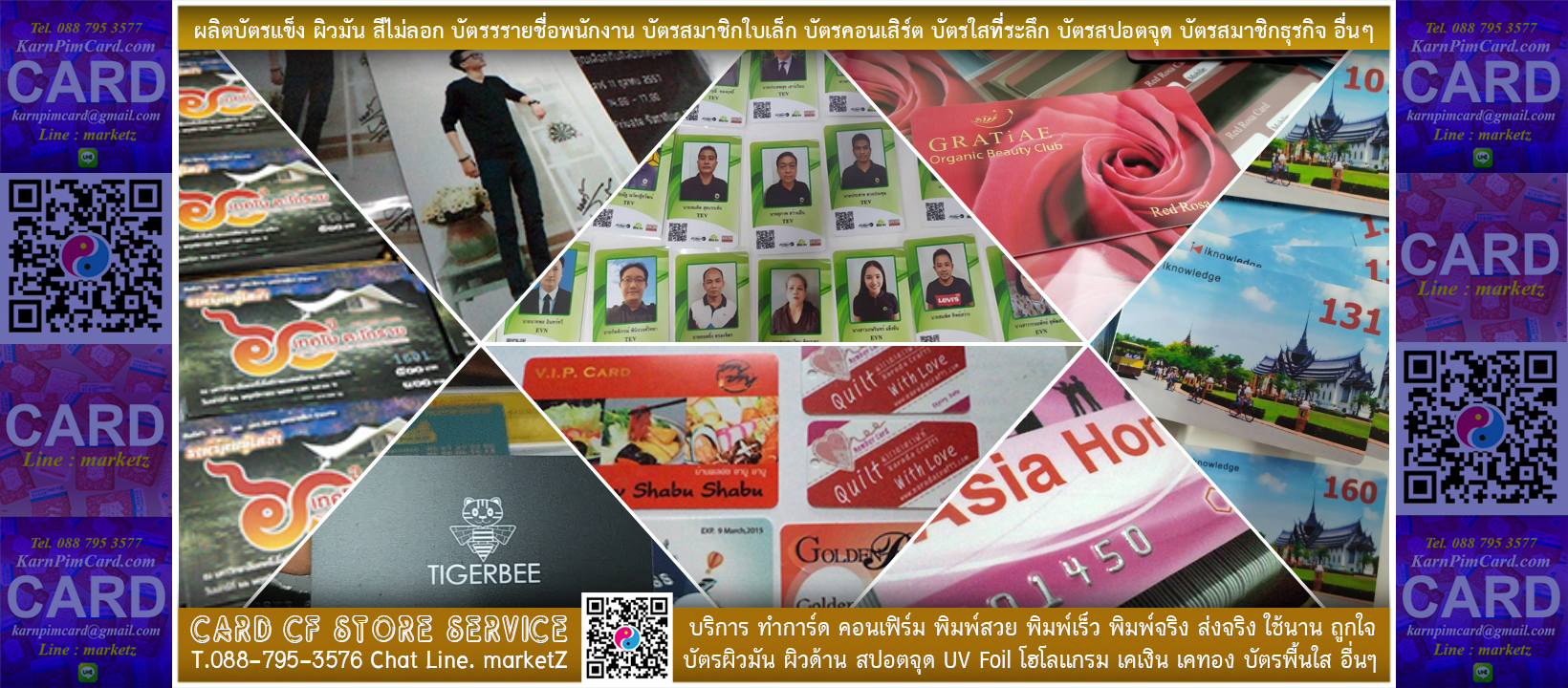 Card CF Store ConTact Line id. marketz - ConFirm Store Card ฟรี..ทำแบบให้ ผลิตบัตรแข็ง พิมพ์เร็ว พิมพ์ดี พิมพ์สวย พิมพ์ทน พิมพ์สี พิมพ์ได้ เริ่มจำนวนน้อย เพิ่มเติม Line id. marketz หรือ โทร. 088 795 3576 พิมพ์การ์ดคุณภาพมาตรฐาน การพิมพ์การ์ดแข็ง ภาพสีคมชัด ถูกแดดถูกน้ำ สีไม่ลอก และ ไม่ซีดจาง แถมส่งฟรี ทำบัตรพิมพ์เคทอง ปั๊มฟอยล์เงิน รับทำบัตรแถบแม่เหล็ก ฟรีรันเลข หรือรันบาร์โค้ด การ์ดการพิมพ์ พิมพ์สี 2 หน้า ราคาถูก บัตรพื้นประกาย บัตรปั๊มฟอยล์ บัตรแถบแม่เหล็ก บัตรเคลือบด้าน บัตรคีย์การ์ด บัตรทาบ บัตร RFID บัตรโปร่งแสง บัตรคอนเสิร์ต บัตรอื่นๆ