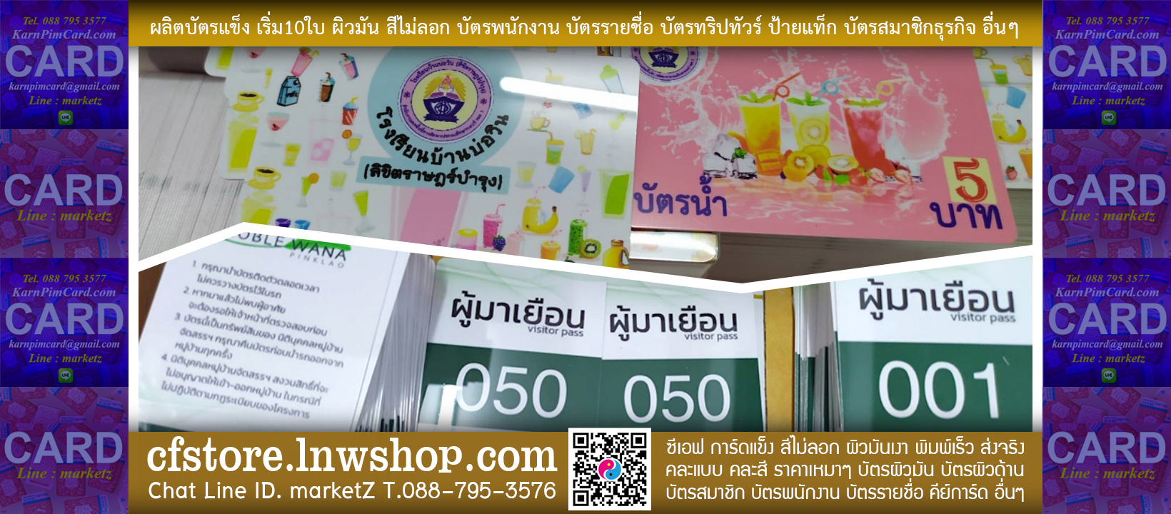 Card CF Store ConTact Line id. marketz - ConFirm Store Card ฟรี..ทำแบบให้ ผลิตบัตรแข็ง พิมพ์เร็ว พิมพ์ดี พิมพ์สวย พิมพ์ทน พิมพ์สี พิมพ์ได้ เริ่มจำนวนน้อย เพิ่มเติม Line id. marketz หรือ โทร. 088 795 3576 พิมพ์การ์ดคุณภาพมาตรฐาน การพิมพ์การ์ดแข็ง ภาพสีคมชัด ถูกแดดถูกน้ำ สีไม่ลอก และ ไม่ซีดจาง แถมส่งฟรี ทำบัตรพิมพ์เคทอง ปั๊มฟอยล์เงิน รับทำบัตรแถบแม่เหล็ก ฟรีรันเลข หรือรันบาร์โค้ด การ์ดการพิมพ์ พิมพ์สี 2 หน้า ราคาถูก บัตรพื้นประกาย บัตรปั๊มฟอยล์ บัตรแถบแม่เหล็ก บัตรเคลือบด้าน บัตรคีย์การ์ด บัตรทาบ บัตร RFID บัตรโปร่งแสง บัตรคอนเสิร์ต บัตรอื่นๆ